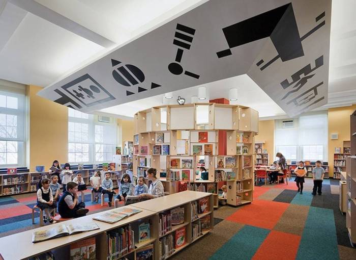 У цій школі до оформлення та облаштування школи теж підійшли творчо. Велике приміщення, цікавий дизайн, зручне розташування елементів — усе це робить бібліотеку місцем, де діти хочуть проводити час, розважатися і дізнаватися щось нове. Дуже цікавий елемент — круговий стелаж у центрі залу.