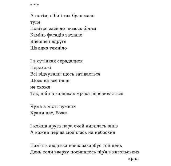 Живі та мертві, валькірії та духи війни, забутий Бог і втомлений Сатана. Ті, що чекають, і ті, кого вже ніхто не дочекається. Смерть, яка ховається просто під ліжком. Поранені, кава, турнікети, миші в окопах. Дні, схожі один на одного, як близнюки. «Нема ніякої долі. Не було ніякої змови. Просто деякі люди народились. Просто деяких людей не стало».