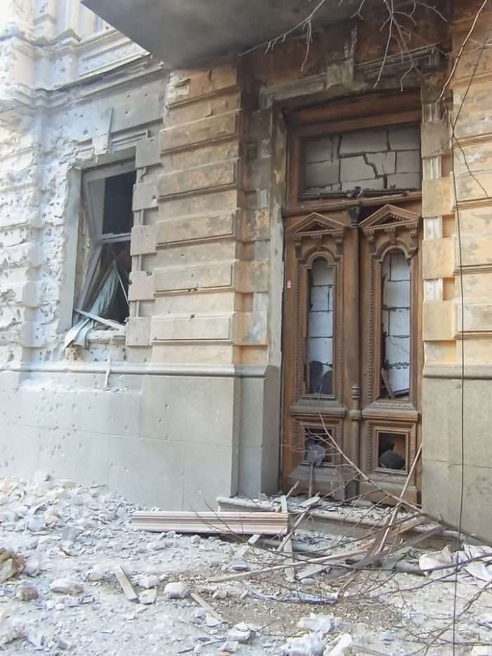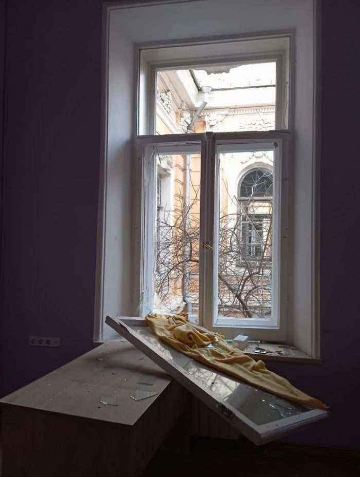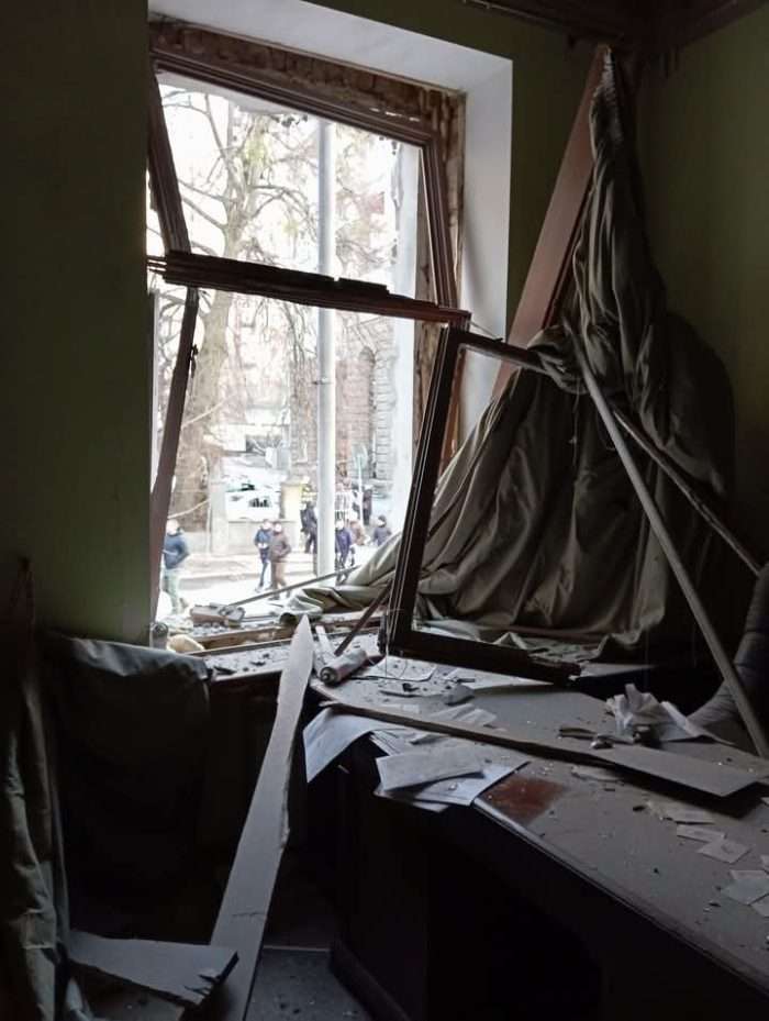 Як свідчать фото з місця події, у будівлі вибито вікна, пошкоджено фасадне оздоблення.