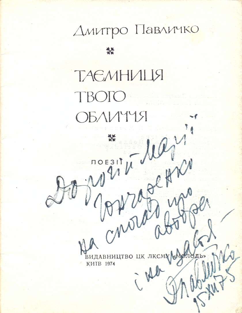 Дмитро Васильович, час якого був розписаний по хвилинах, подарував мені збірку “Таємниця твого обличчя”. Показуйте свої вірші, – сказав. – Я їх не принесла, – сором’язливо відповіла. – Принесете, десь за тиждень, подзвоніть, – мовив лагідно…