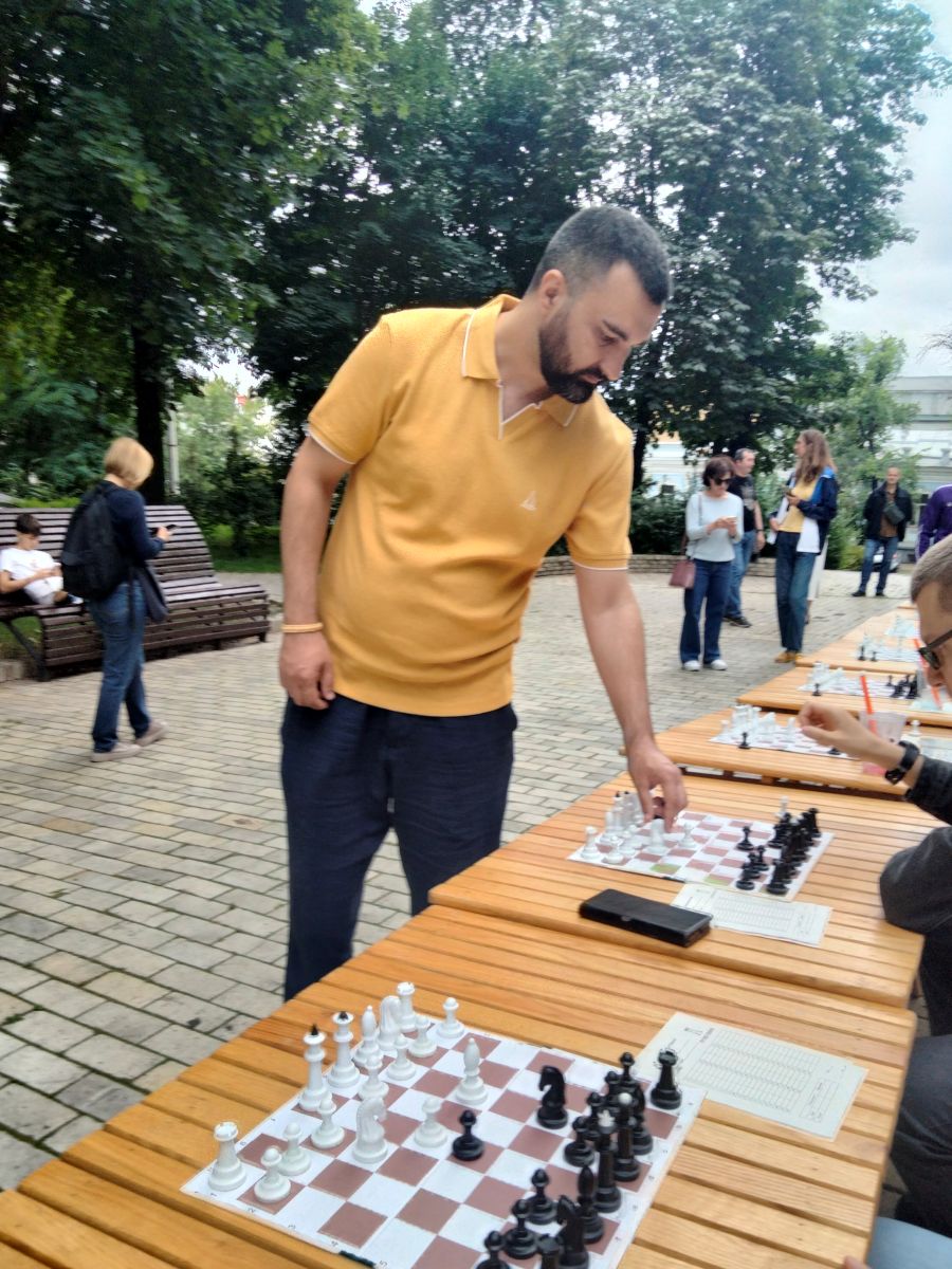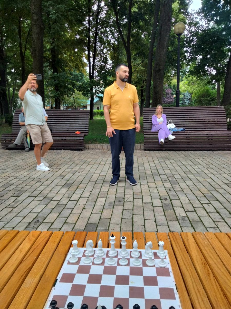 Я прийшов сюди на сеанс одночасної гри на двадцяти дошках, який 20 липня 2025 року, в Міжнародний день шахів, дає для аматорів знаний гросмейстер. Волонтери Федерації шахів України розставляють складані фанерні столики, розкладають картонні шахівниці й виймають з коробок фігури.